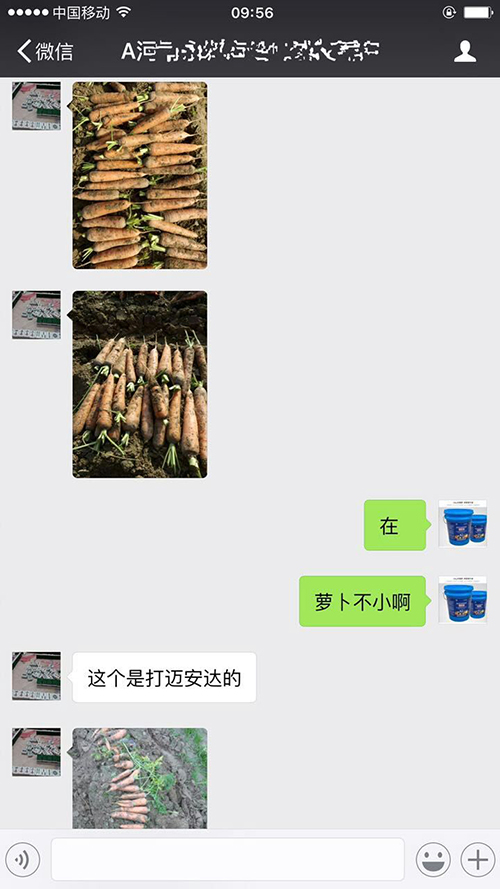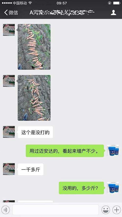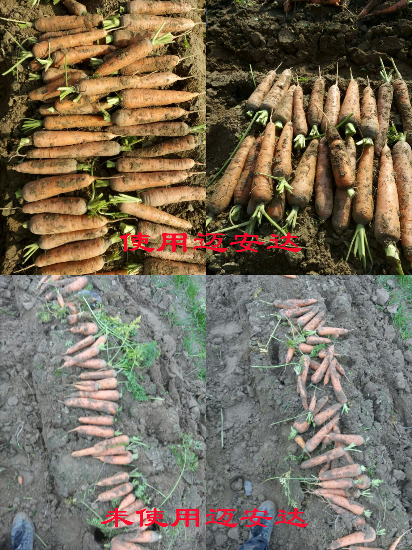 用过“迈安达”萝卜专用叶面肥的胡萝卜每亩增产1000多斤。每斤还要比没用过迈安达的价格高0.1元。